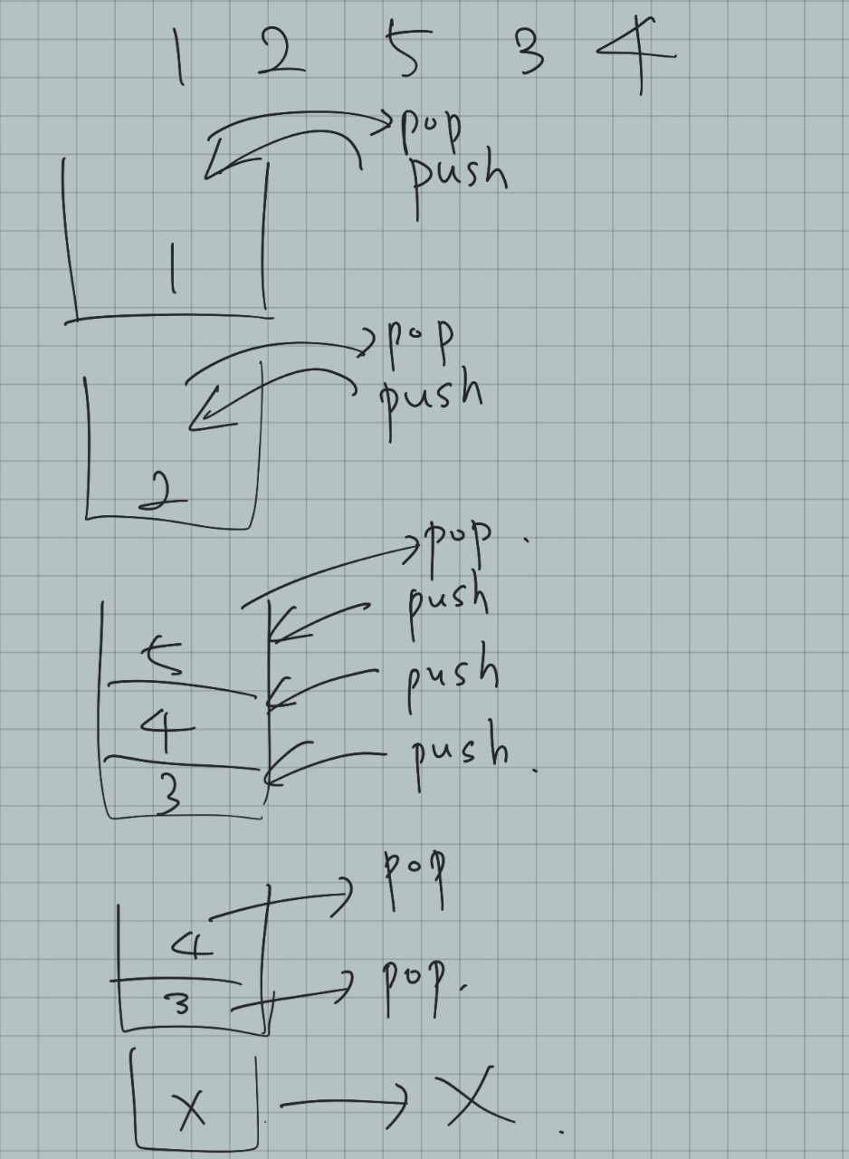 [1, 2, 5, 3, 4]가 그 예시인데, 5에서 pop을 하고 나면 stack에는 4, 3이 위치한다. 그런데 그 다음 수가 4가 아닌 3이어서 4를 pop하고 3을 pop해서 4가 소실된다. 다시 숫자를 push해줄 수 없기 때문에 이 경우 NO를 출력하게 되는 것이다.