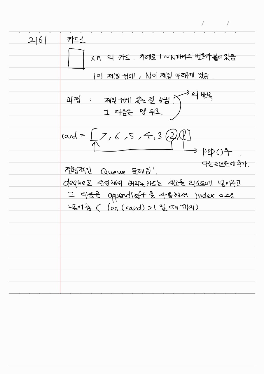 N장의 카드가 있다. 각각의 카드는 차례로 1부터 N까지의 번호가 붙어 있으며, 1번 카드가 제일 위에, N번 카드가 제일 아래인 상태로 순서대로 카드가 놓여 있다. 이제 다음과 같은 동작을 카드가