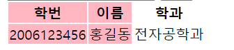 해당 예시는 <col> 요소를 사용해 span="2"로 지정해 "학번", "이름" 열이 두개로 묶인 것을 확인할 수 있음