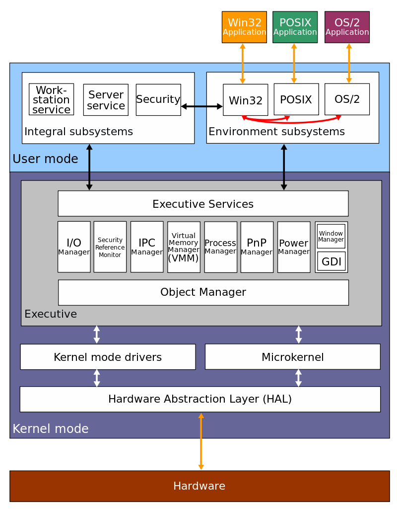 - environment subsystems(환경 하위 시스템): win32, os/2, posix 3개의 하위 시스템이 존재