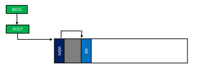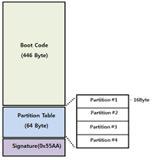 - MBR의 부트 코드는 파티션 테이블에서 부팅 가능한 파티션을 찾아 해당 파티션의 VBR의 부트 코드(부트 섹터 = 1sector)를 호출하는 역할을 함