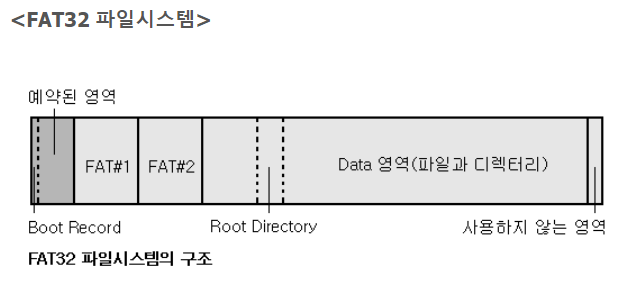 - FAT 영역: 파일 할당 테이블로 데이터 영역에 저장된 파일들의 할당 관계를 표시함