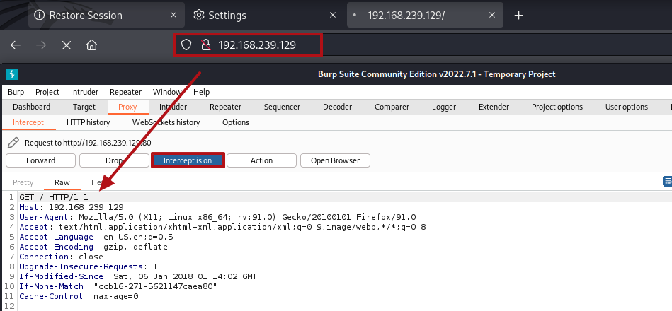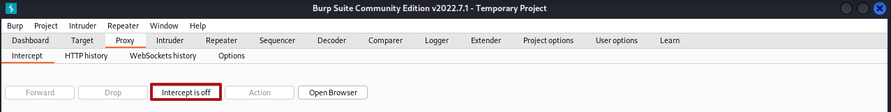 burp suite intercept에서 intercept is off -> intercept is on으로 바꿔주면 browser에서의 request를 burp suite가 잡음