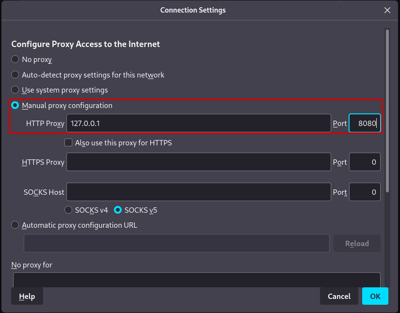 3. Manual Proxy configuration -> HTTP Proxy란에 127.0.0.1(ip)와 8080(port)를 입력함 -> OK