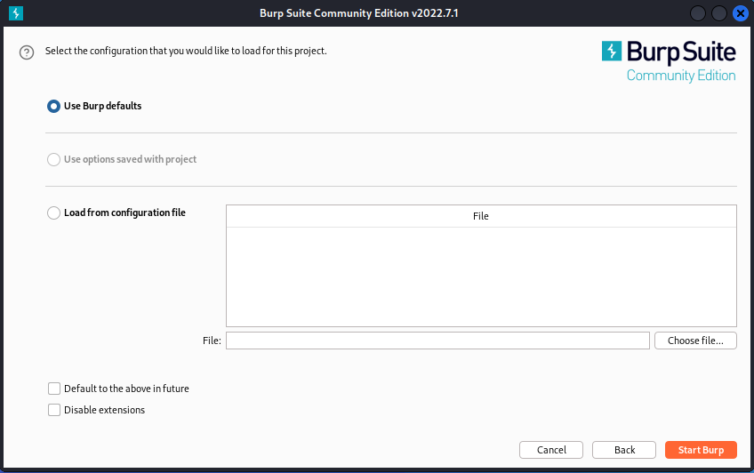 Use Burp defaults를 클릭 -> Start Burp
