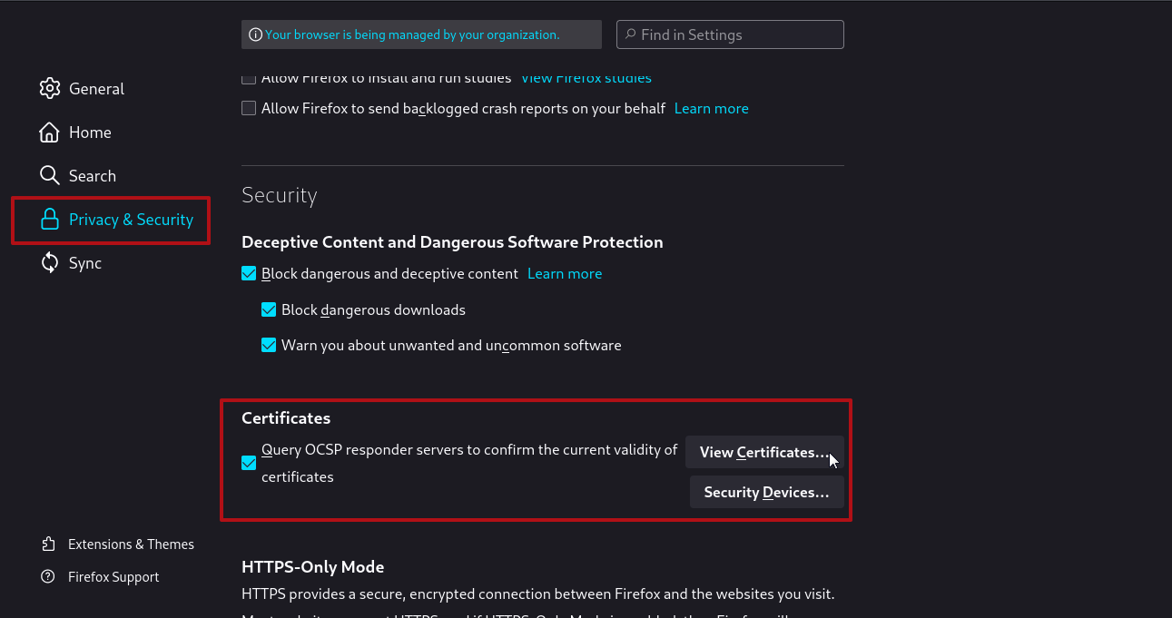 Privacy & Security -> Certificate -> View Certificates 클릭