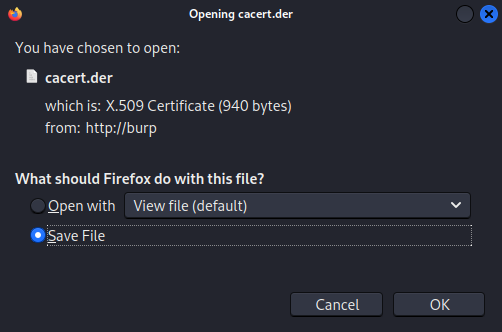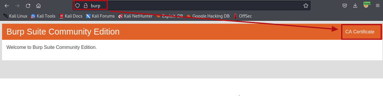 2-1. burp로 들어가서 CA Certificate를 눌러 인증서를 다운 받음(cacert.der 파일이 다운받아짐)