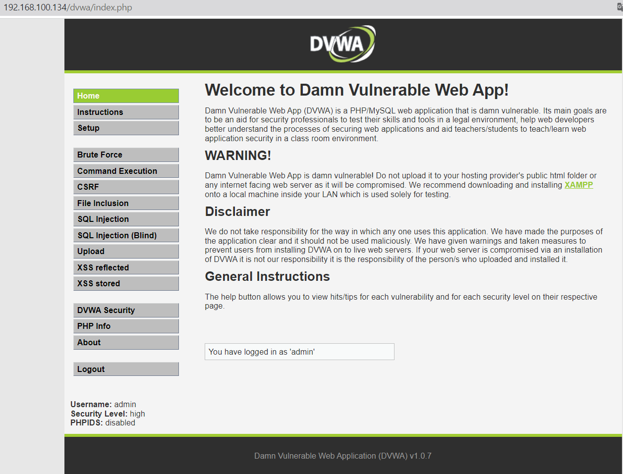 5. DVWA 실행(ID: admin, Password: password)