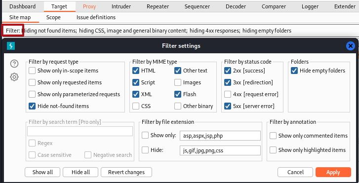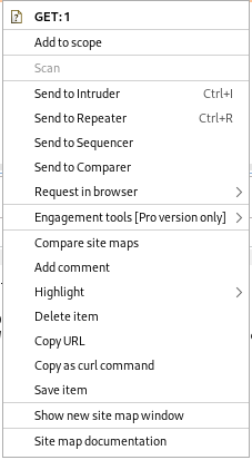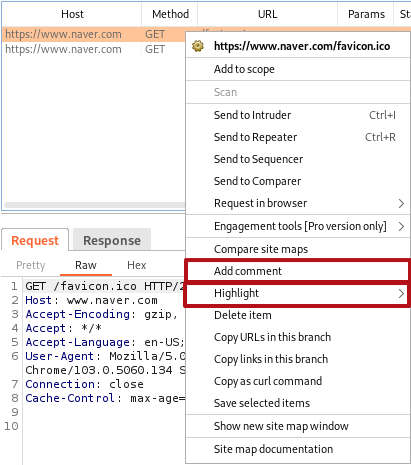 | Add to scope / Remove from scope | 선택한 항목을 필터링을 위한 목록에 추가하거나 삭제. 추가한 항목은 Target의 Scope 탭에서 설정할 수 있고 필터링을 이용하는 경우 적용됨 |