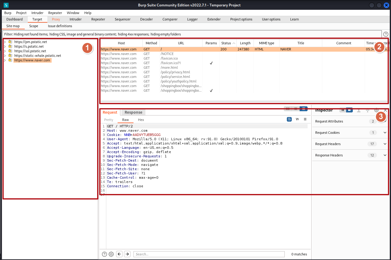 프락시를 통해 요청한 항목과 애플리케이션의 응답으로부터 추측할 수 있는 콘텐츠는 Target의 Stie map 항목에 추가됨