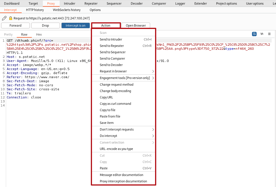 [Action] 버튼은 현재 가로챈 패킷으로 수행할 수 있는 기능을 출력함(Site map의 Context 메뉴와 같은 역할)