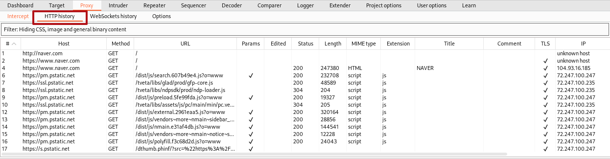 Target의 Site map과 마찬가지로 HTTP history 탭에 모든 메시지를 기록함