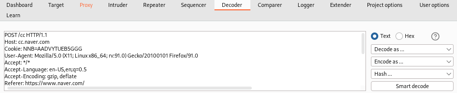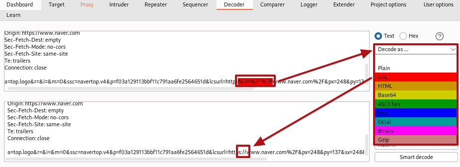 내가 원하는 부분을 드래그한 후 Decode as, Encode as, Hash를 클릭하거나 Smart decode를 클릭하여 자동으로 디코딩하면 됨