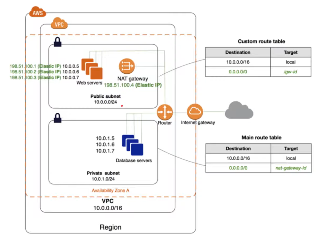 public subnet 안에 통신 게이트웨이인 NAT gateway를 만든다.private subnet에서도 local network외의 ip는 모두 NAT gateway로 트래픽을 가게 한다.즉 private subnet에 속한 pc는 로컬 ip이외의 대상이 통신할 경우 무조건 NAT Gateway로 트래픽을 보낸다.즉 외부에서 private subnet에 직접 접근이 불가능하다.