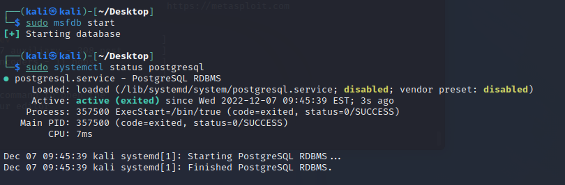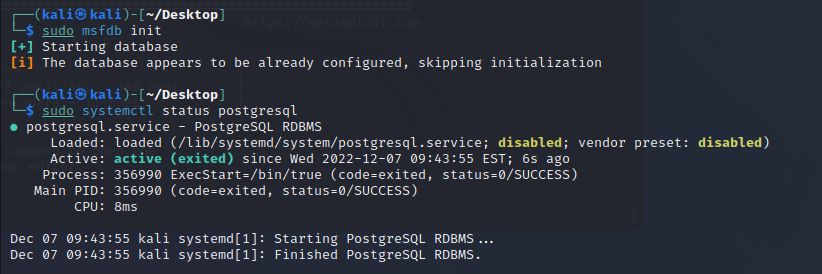 Setup our Metasploit Database In Kali, you will need to start up the postgresql server before using the database. root@kali:~# systemctl start postgresql After starting postgresql you need to create and initialize the msf database with msfdb init root@kali