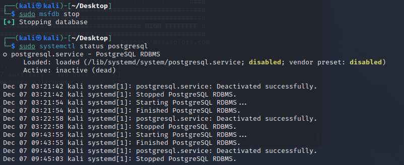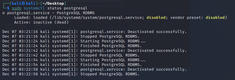 msfdb 초기화 시 database가 시작됨 -> postgresql도 마찬가지로 active 상태가 됨