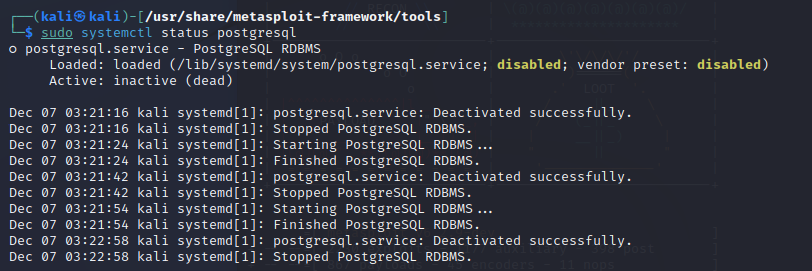2. sudo msfconsole 구동 후 postgresql status 확인