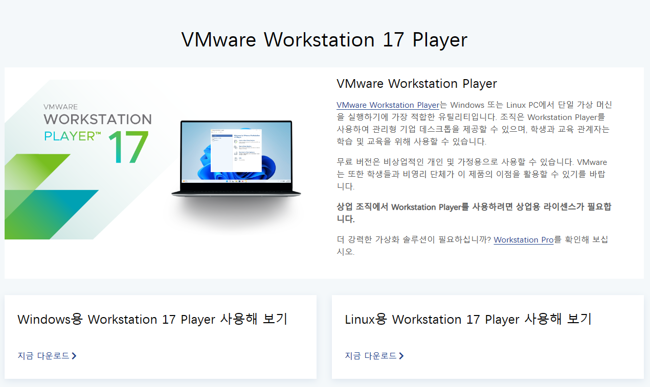 2. VMware 다운로드(VMware Workstation Player 다운로드 | VMware | KR)