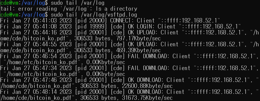 sudo tail /var/log/vsftpd.log