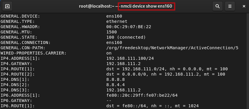 3) nmcli device show 인터페이스이름 명령어를 통해 제대로 설정이 되었는지 확인