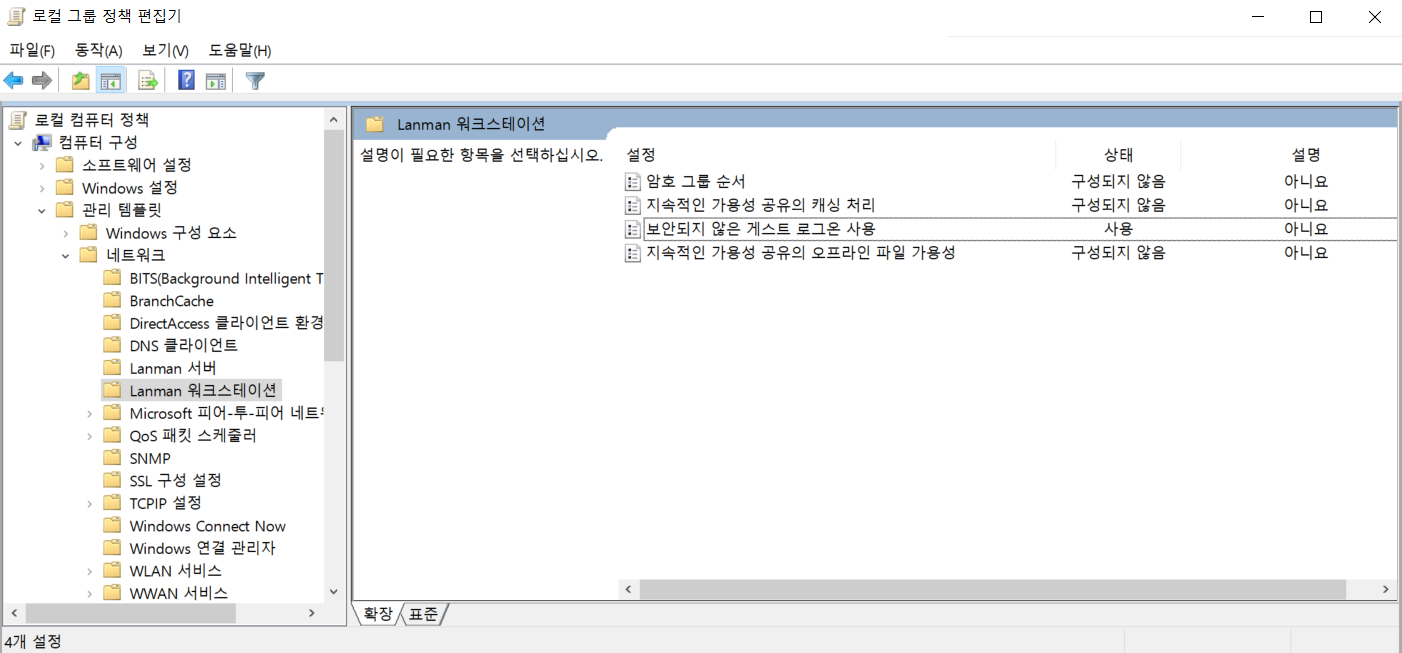 로컬 컴퓨터 정책 > 컴퓨터 구성> 관리 템플릿 > 네트워크 > Lanman 워크스테이션 > 보안되지 않은 게스트 로그온 사용 사용으로 바꿔줌