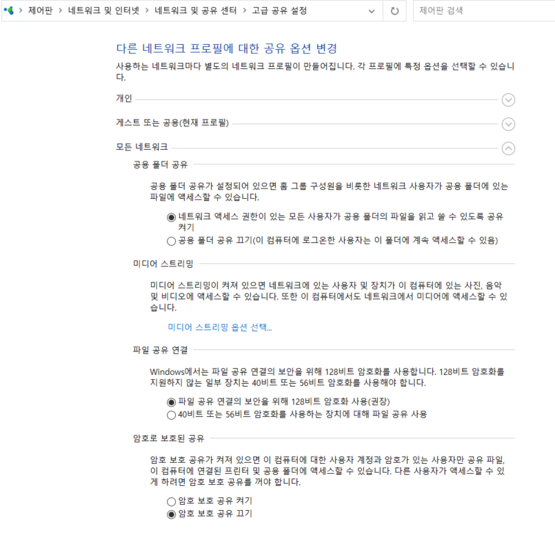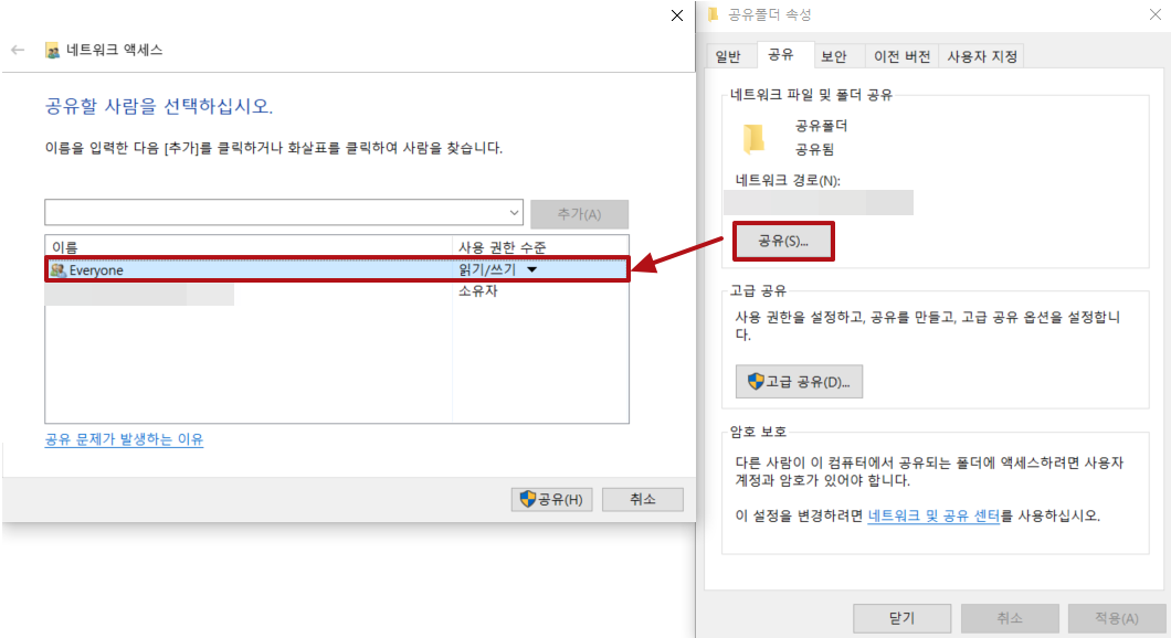 위의 모든 네트워크 설정에서 암호로 보호된 공유 - 암호 보호 공유 켜기하면 아래 자격 증명 정보를 입력해야 함