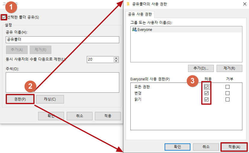 3. 선택한 폴더 공유 > 권한 > 허용 > 적용 > 확인