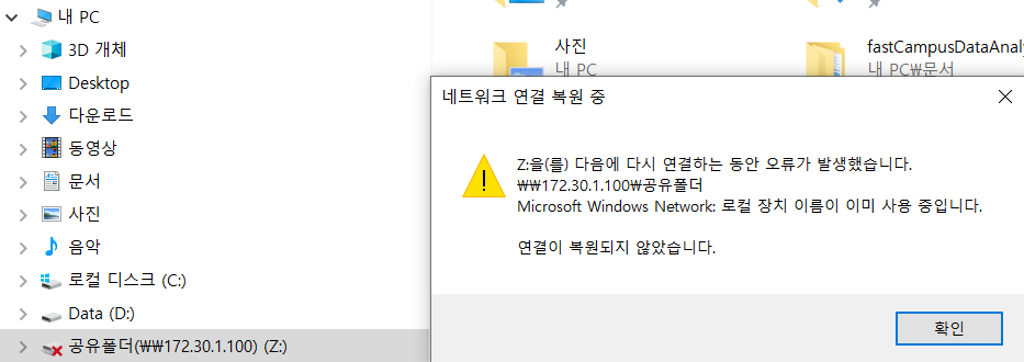 - 부팅하자마자 탐색기에서 공유폴더 error와 네트워크 연결 복원 중이라는 메세지 뜸