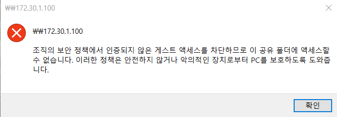 실행창 - \\공유폴더IP > 보안 정책에서 인증되지 않은 게스트 엑세스 차단