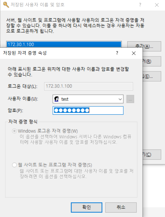 * 네트워크 자격 증명 입력에서 내 자격 증명 기억을 클릭하면 아래 저장된 사용자 이름 및 암호에 저장됨