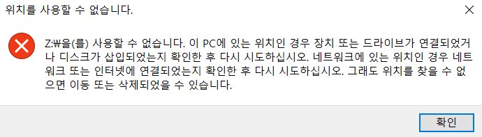 - 해당 에러는 탐색기에서 공유폴더 클릭 후 연결 해제 한 뒤 탐색기를 종료하지 않고 다시 클릭해서 나오는 에러임. 탐색기 종료 후 켜면 공유폴더가 사라진 것을 볼 수 있음(우)
