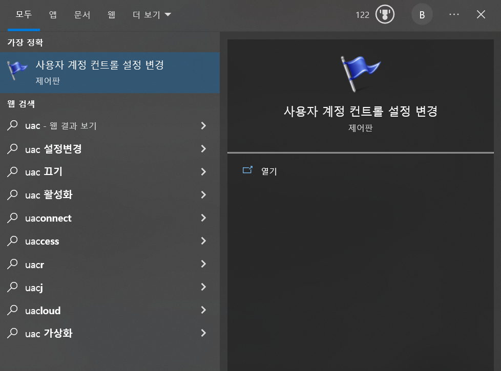 - UAC 설정 레벨이 "앱에서 사용자 모르게 컴퓨터를 변경하려는 경우에만 알림(기본값)"으로 되어 있는 경우 "msconfig"