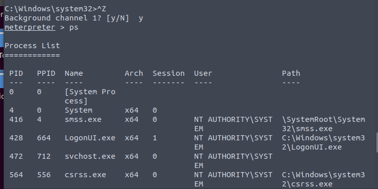 - meterpreter 쉘에서 ps 명령어로 실행중인 모든 프로세스 나열