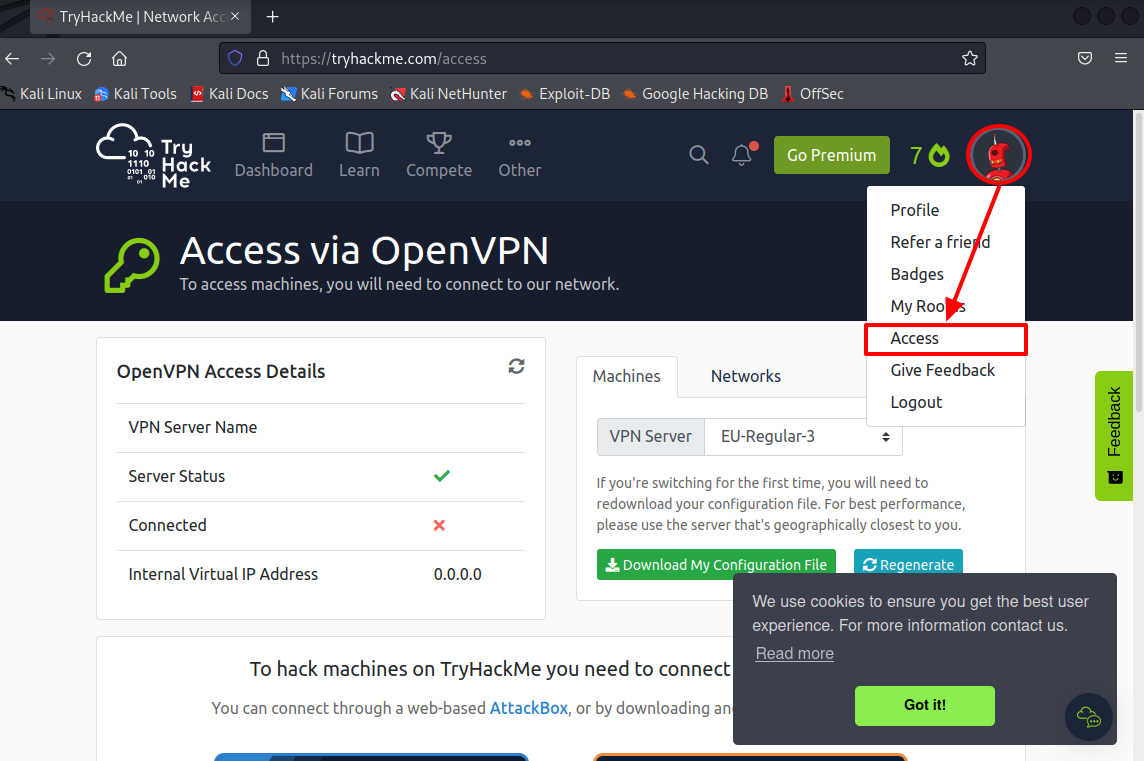1. tryhackme 사이트 접속 후 프로필 > access 클릭하기