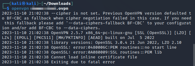 - 해당 부분을 인터넷 사이트에서 해결한 방법으로 수정 완료하였으나, tryhackme 자체에서 제공하는 설정 파일하고 내 kali에 깔린 OpenVPN의 버전 차이로 인해 문제가 발생하는 듯 싶다. 그래서 tryhackme의 VPN 연결 지역을 바꾸어 바로 openvpn으로 실행하니 VPN 연결되었다.