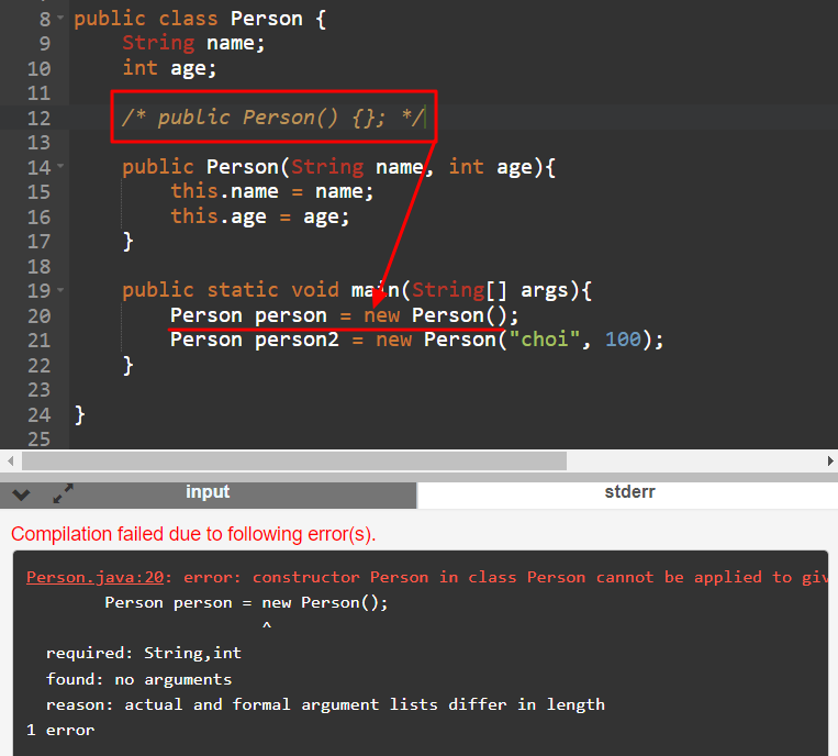 - 좌측은 기본 생성자를 명시적으로 작성하여 new Person() 객체 생성 시 문제가 안된 반면, 우측은 기본 생성자를 작성하지 않자 Person person = new Person(); 시 error가 발생함
