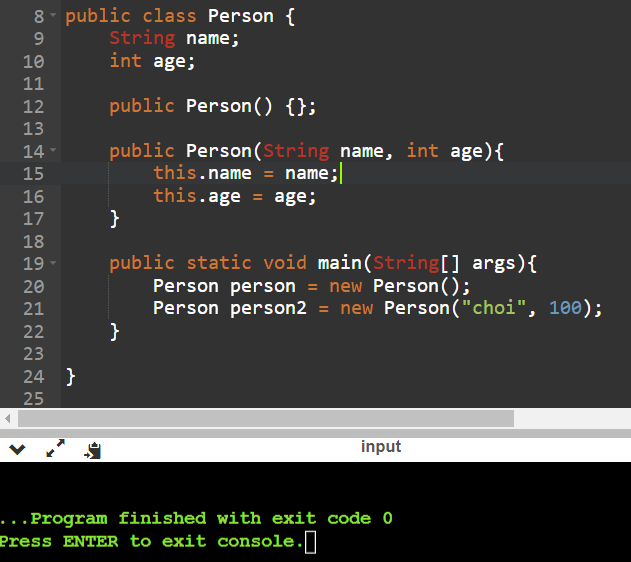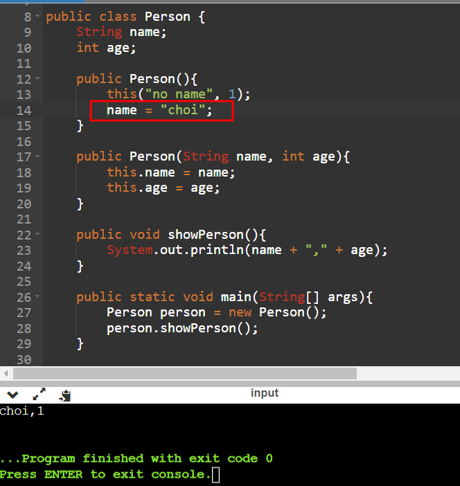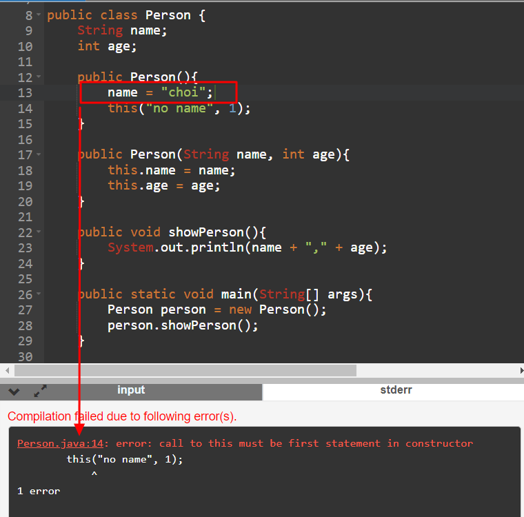 - Person() 생성자에서 this를 사용해 다른 오버로딩된 생성자를 호출할 수 있음