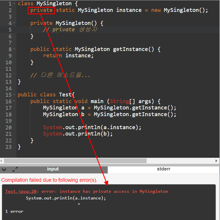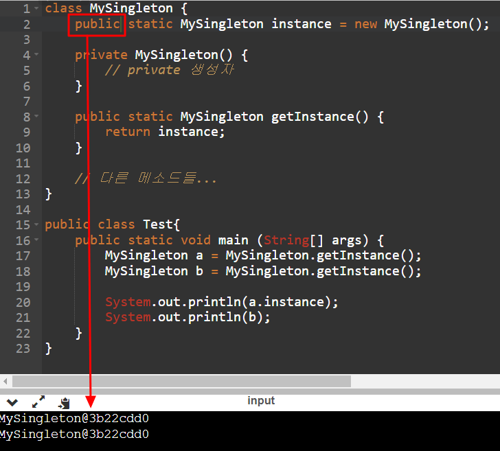 ※ 해당 instance를 private static이 아닌 public static으로 선언하면 해당 인스턴스는 외부에서 직접 접근이 가능하기 때문에 싱글톤 패턴을 사용하는 의도를 깨뜨릴 수 있음 => private로 선언하고 특정 메소드를 통해 "간접적"으로 접근하는 것이 핵심