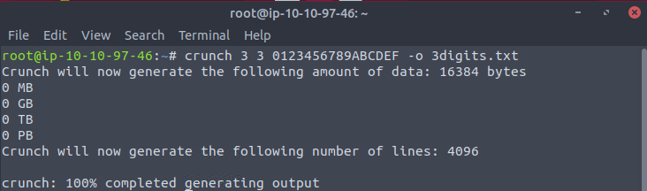 crunch 3 3 0123456789ABCDEF -o 3digits.txt
