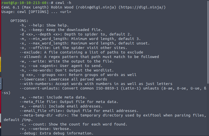 --offsite : CeWL은 기본적으로 외부 사이트를 스파이더링하지 않지만, 해당 옵션 사용시 가능함