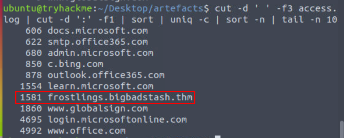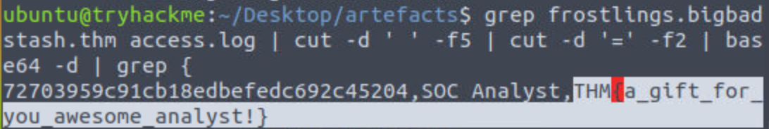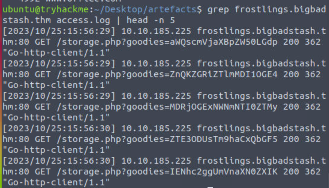 grep frostlings.bigbadstash.thm access.log | head -n 5 | cut -d ' ' -f5 | cut -d '=' -f2
