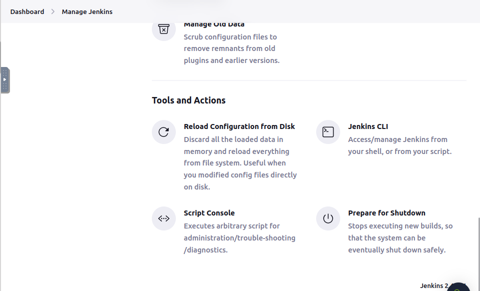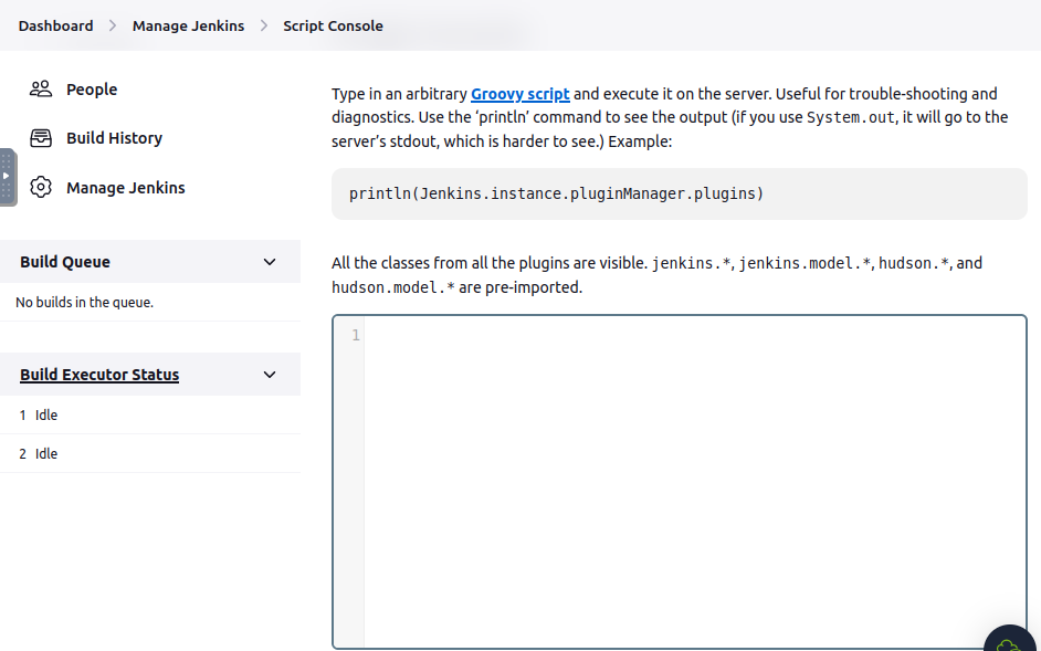 - manage Jenkins > Tools and Actions > Script Console 클릭