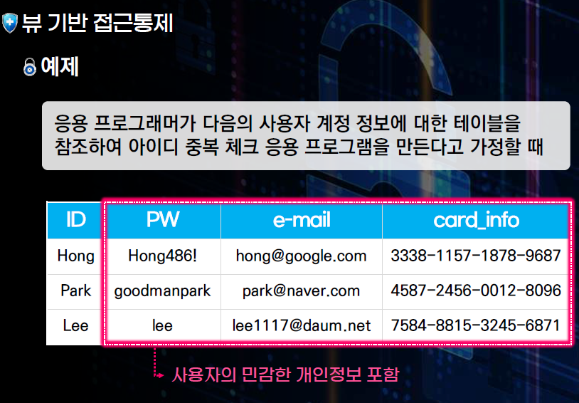 | 1. 질의어 간속화 - 검색을 위한 복잡한 SQL 문을 매번 작성하지 않아도 됨 2. 데이터에 대한 보안 - 사용자에게 접근이 허용된 테이블 내 일부 데이터만을 제한적으로 보여주고자 할 때 사용 > 물리적 테이블의 민감한 데이터가 보여지지 않도록 구성 가능 3. 논리적 데이터 독립성 - 데이터베이스에 영향을 주지 않고, 응용 프로그램이 원하는 형태로 데이터에 접근할 수 있도록 함 |