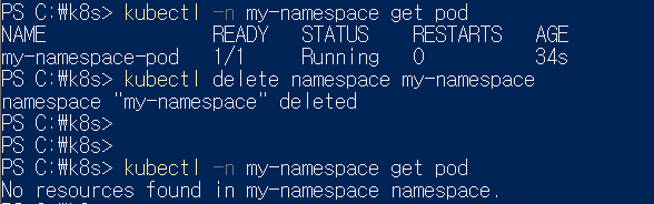 - namespace 삭제 시 해당 namespace에 위치한 pod도 같이 삭제